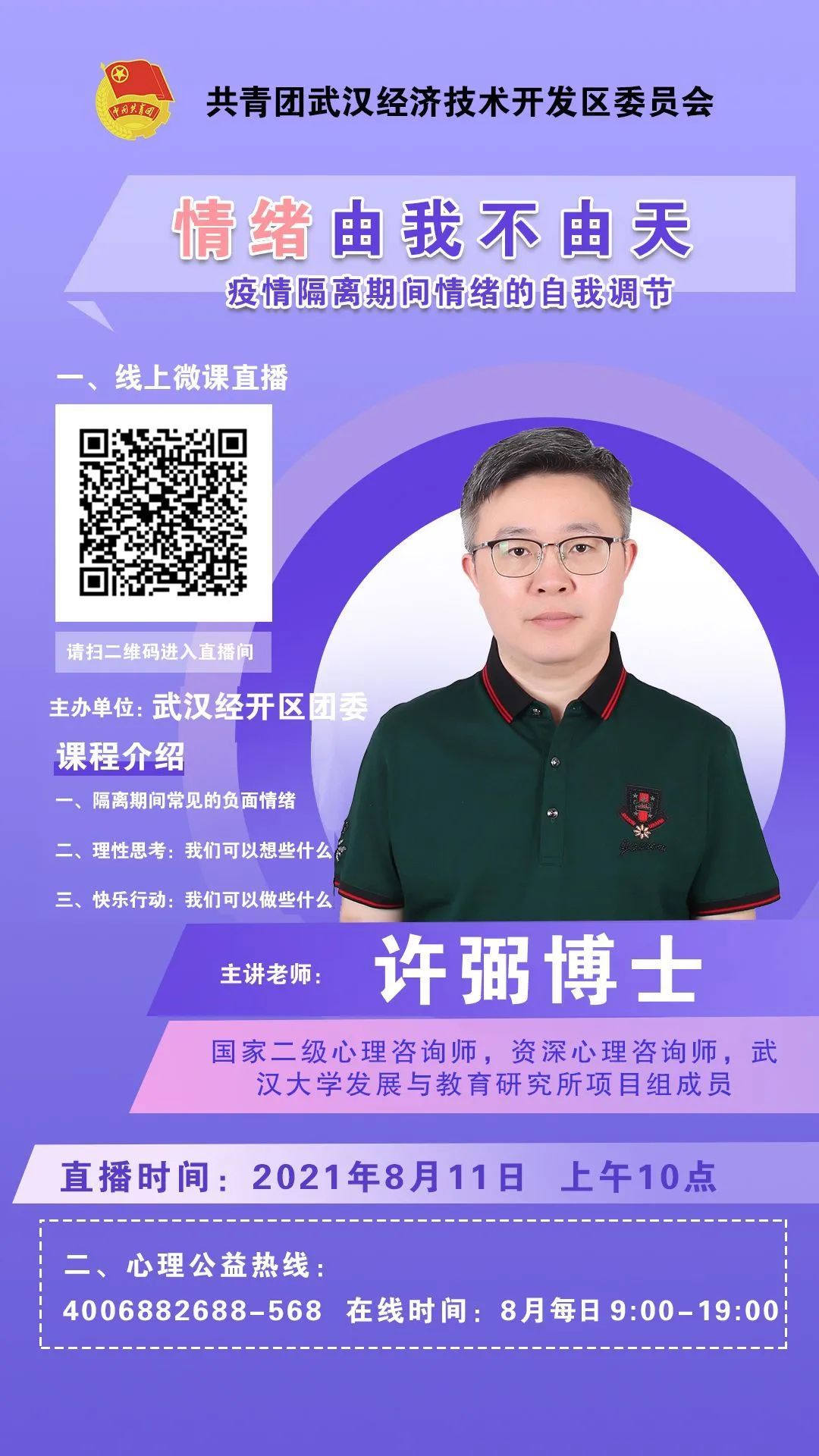 8月11日上午10点,团区委将特邀国家二级心理咨询师、资深心理咨询师、武汉大学发展与教育研究所项目组成员许弼博士为隔离在40余个酒店的青年定制一堂以“情绪由我不由天——疫情隔离期间情绪的自我调节”为主题的线上微课,帮助隔离点的青年们及时疏解和调节战“疫”期间消极情绪,筑牢车谷青年的抗疫心理防线。
