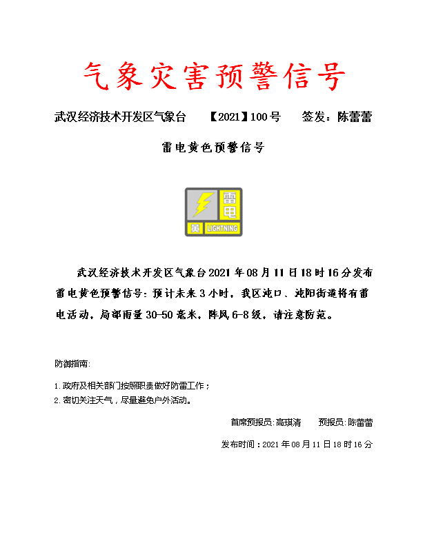 车谷融媒8月11日讯 武汉经开区气象台08月11日19时11分发布雷电黄色预警信号:预计未来3小时,我区军山、纱帽街道将有雷电活动,局部雨量30-50毫米,阵风6-8级,请注意防范。 (来源:武汉经开区气象台) 【编辑:缑曼】