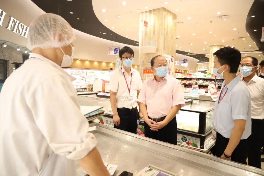在永旺超市经开店,从米面粮油区到日用百货区,刘子清边走边看,与工作人员亲切交谈,了解超市物资储备、保价稳供情况和员工日常工作、生活状况。