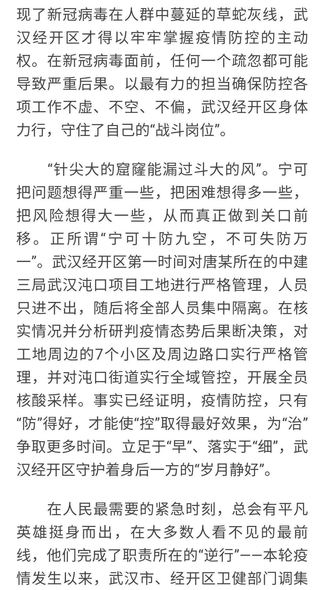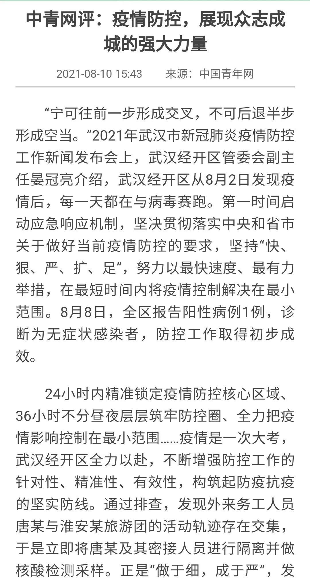 8月10日,中国青年网刊发评论《疫情防控,展现众志成城的强大力量》,文中指出,武汉经开区从8月2日发现疫情后,每一天都在与病毒赛跑,24小时内精准锁定疫情防控核心区域,36小时不分昼夜层层筑牢防控圈,全力把疫情影响控制在最小范围。 (来源:中国青年网 采写:记者韦丰 编辑:吕作璐 蒋秋雨 制作:缑曼) 2