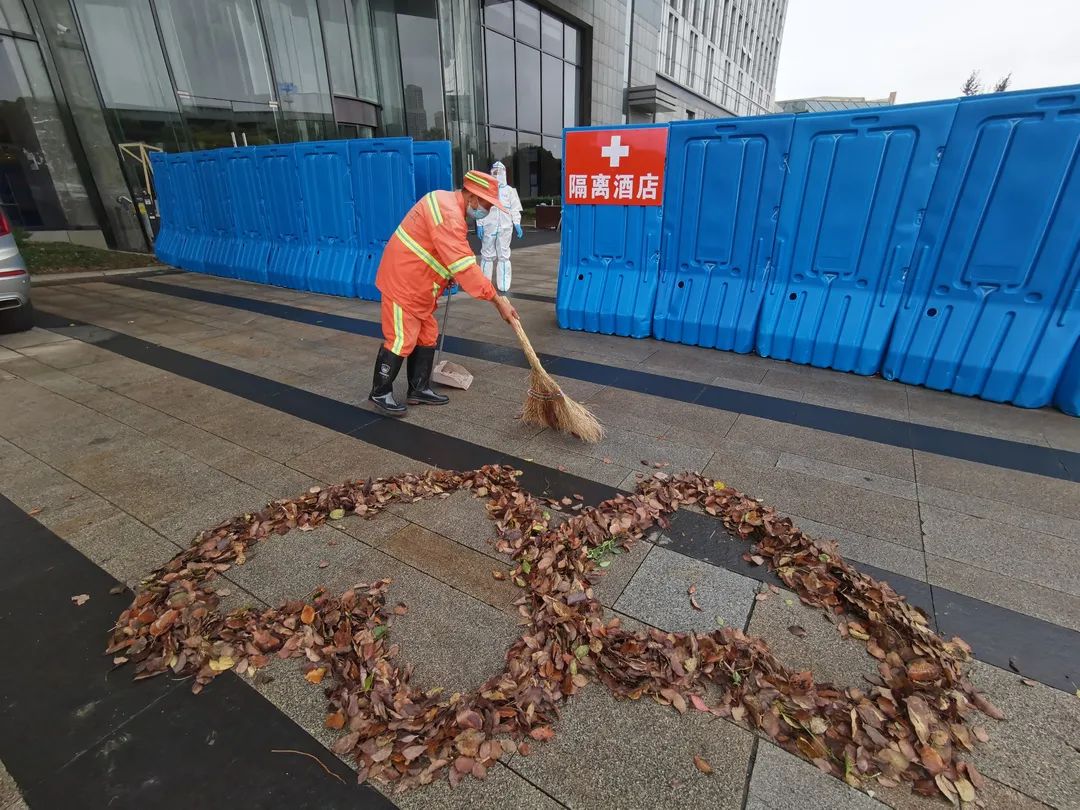 黄师傅把装满落叶的垃圾袋倒在隔离墙外的空地上,用扫帚扫出“心”的造型。“用落叶摆心的造型,看起来简单,实际上没那么容易,刚才查了下手机图片,两个尖尖要摆出棱角看起来才更逼真,再加点落叶,把线条勾勒丰满些。”黄师傅说。