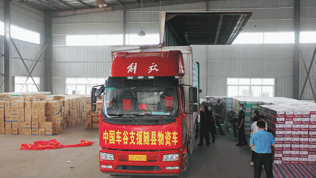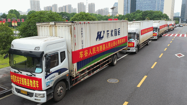 车谷融媒8月15日讯 8月15日上午8点,6辆装满方便面、矿泉水等生活物资的大卡车,从武汉经开区出发,驶向遭受特大暴雨袭击的随县灾区,并于当天中午抵达,及时将赈灾物资送到灾区群众手中。