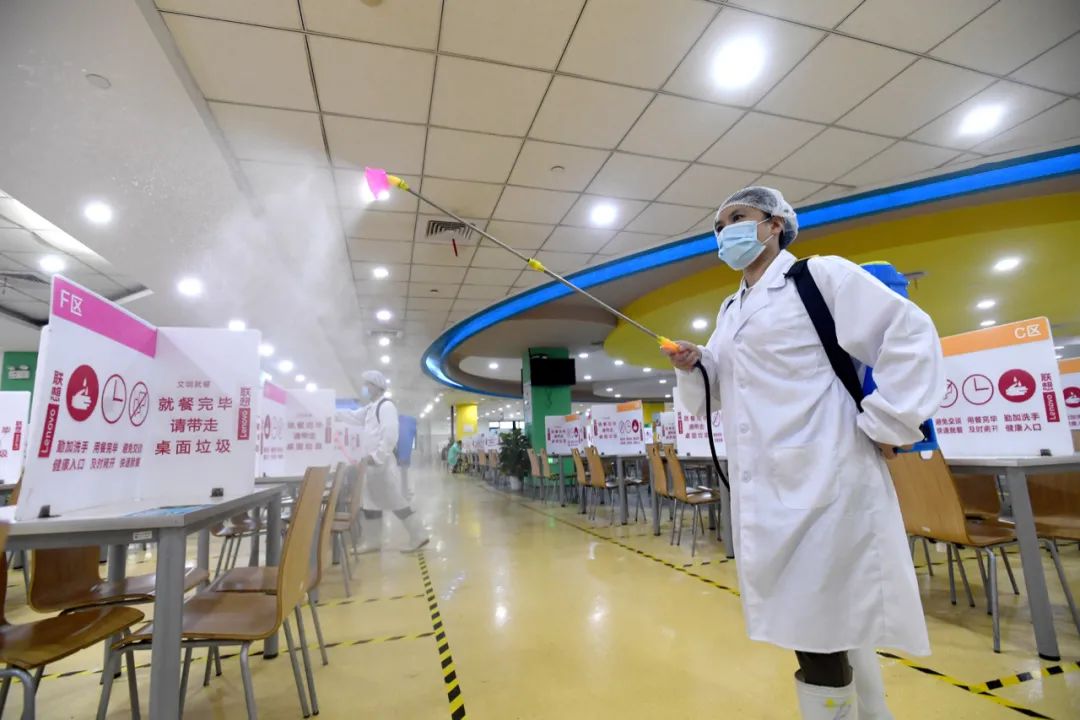 ▲8月15日,消杀人员对联想(武汉)产业基地食堂区域进行喷洒酒精消杀。记者周超 摄