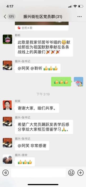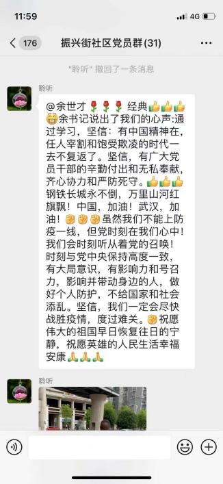 疫情隔离了距离,但是隔离不了大家学习的热情。振兴街社区党员纷纷表示:当前全区仍处于疫情防控关键时期,作为一名党员,将带头落实疫情防控工作要求,严格遵守疫情防控期间各项措施,尽快让群众恢复正常秩序。