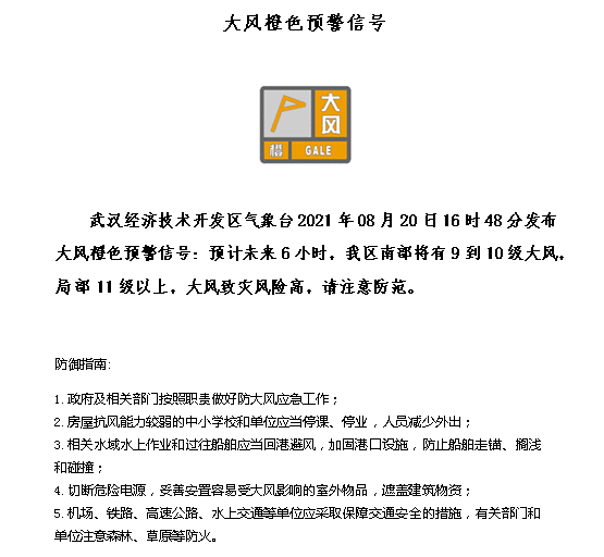车谷融媒8月20日讯 武汉经开区气象台08月20日16时48分发布大风橙色预警信号:预计未来6小时,我区南部将有9-10级大风,局部11级以上,大风致灾风险高,请注意防范! 天气预报:我区今晚阴天有中到大雨,并伴有短时强降水、雷暴大风等强对流天气,偏南风2到3级,气温26至35度;明天白天多云有阵雨或雷阵雨;明晚到后天多云有阵雨。 (来源:武汉经开区气象台) 【编辑:缑曼】