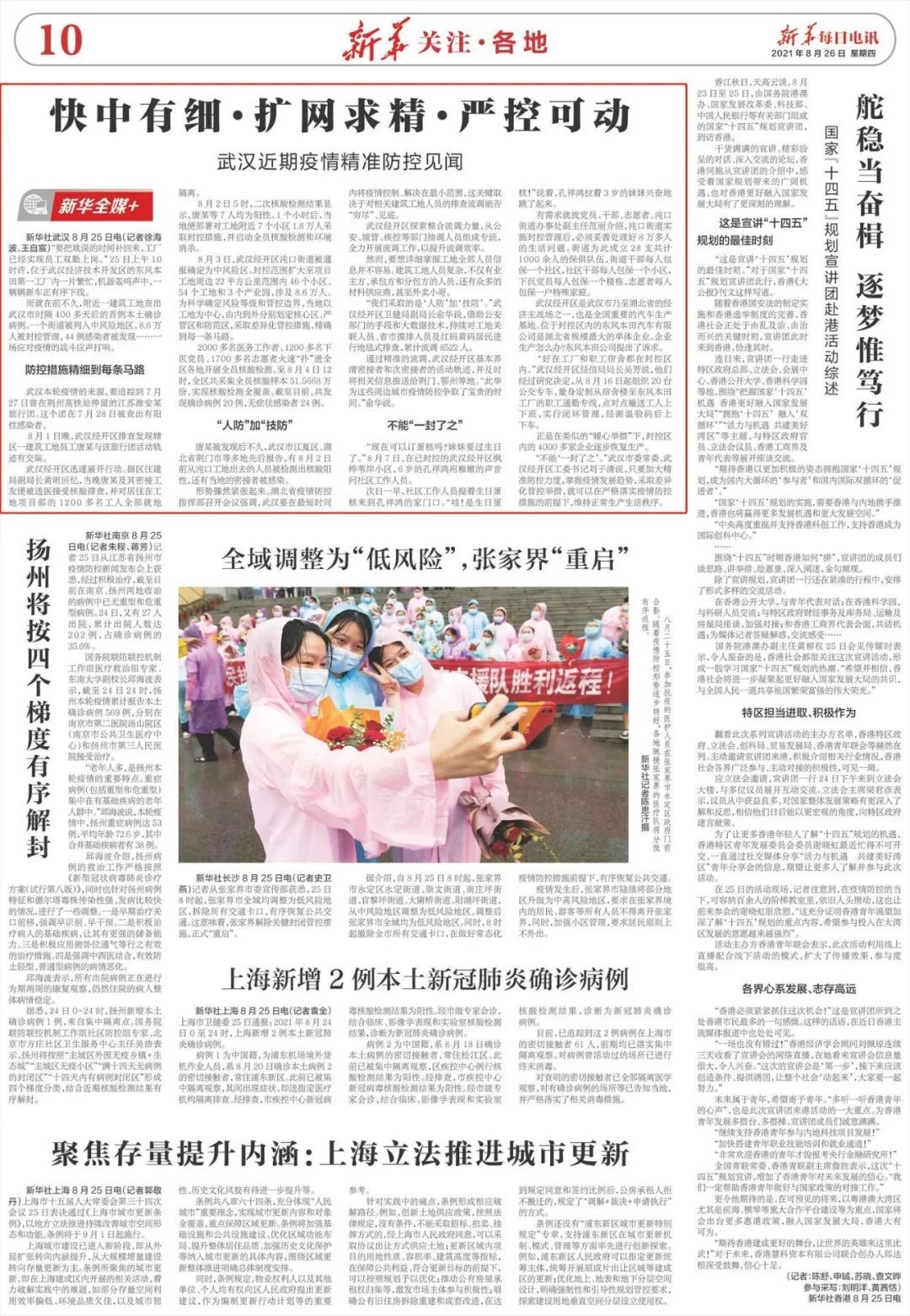 8月26日,《新华每日电讯》刊发《 快中有细·扩网求精·严控可动 武汉近期疫情精准防控见闻》一文,报道武汉经开区迅速落实“快、狠、严、扩、足”和“快、严、准、实、统”工作要求,筑牢防线,精准防控,全力打赢打好疫情防控歼灭战。统筹常态化疫情防控和经济社会发展,做到防控不松懈、疫情不反弹、发展不停步。详情请看????