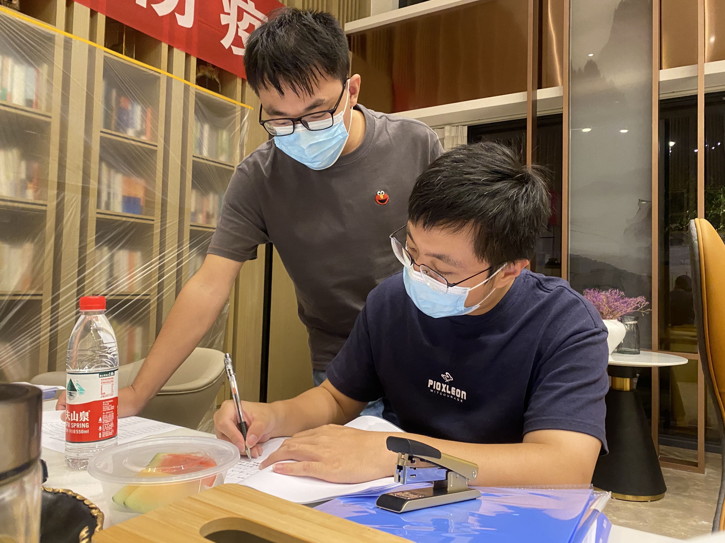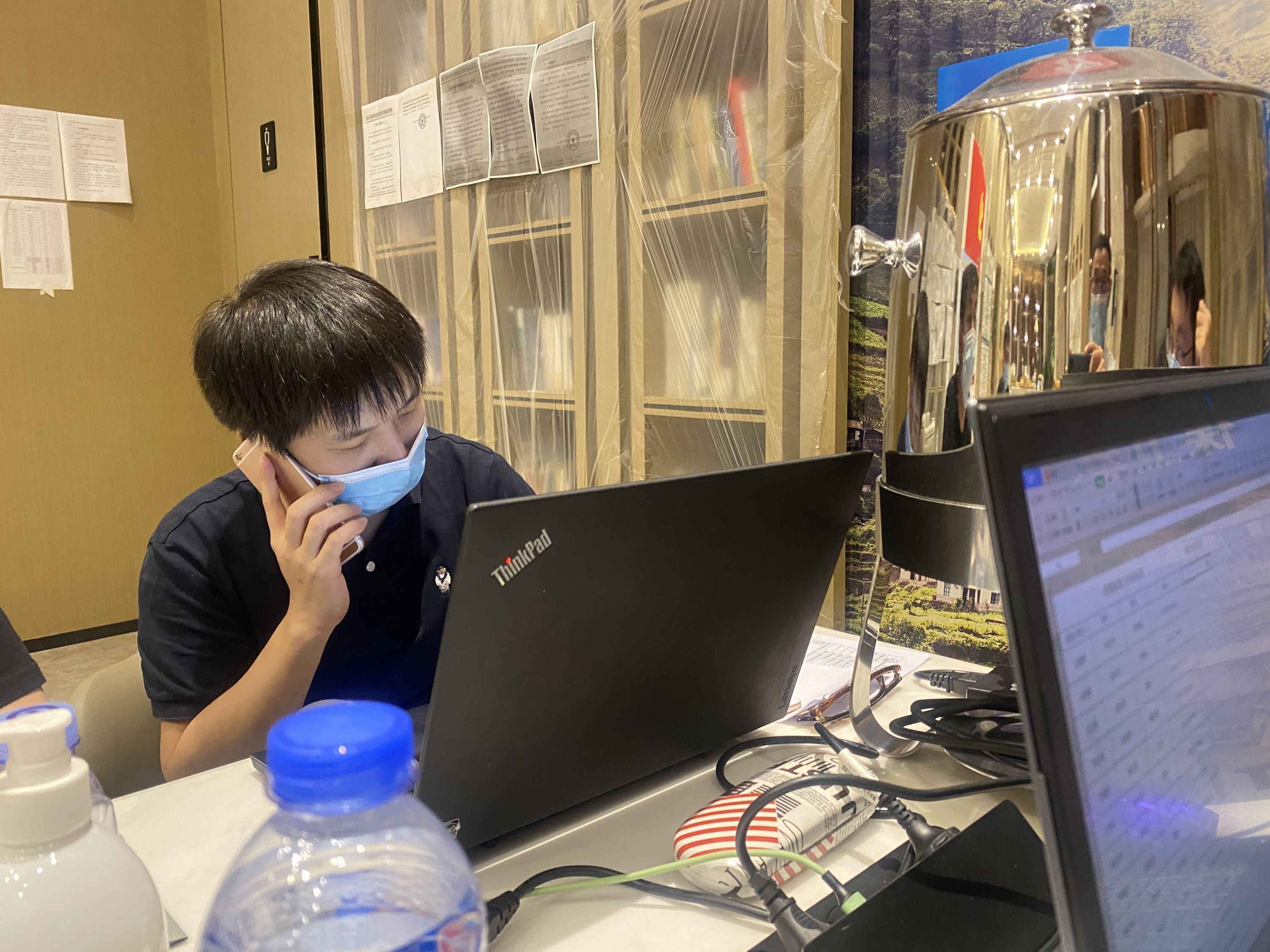 8月29日晚上10点,隔离点的办公大厅依旧灯火通明。工作人员袁心诚和胡勇还在加班加点。作为专班中仅有的2名95后,他们都是毕业工作没多久,都是头一次参加隔离点工作。袁心诚负责解除隔离人员的转出工作,认真登记、反复核对,拨打完接收单位电话后往往已是深夜。原本计划8月份和未婚妻拍婚纱照,也因为工作而推迟。作为隔离点的后勤“总管”,胡勇负责隔离人员和工作人员的饮食,确保全体人员就餐安全。