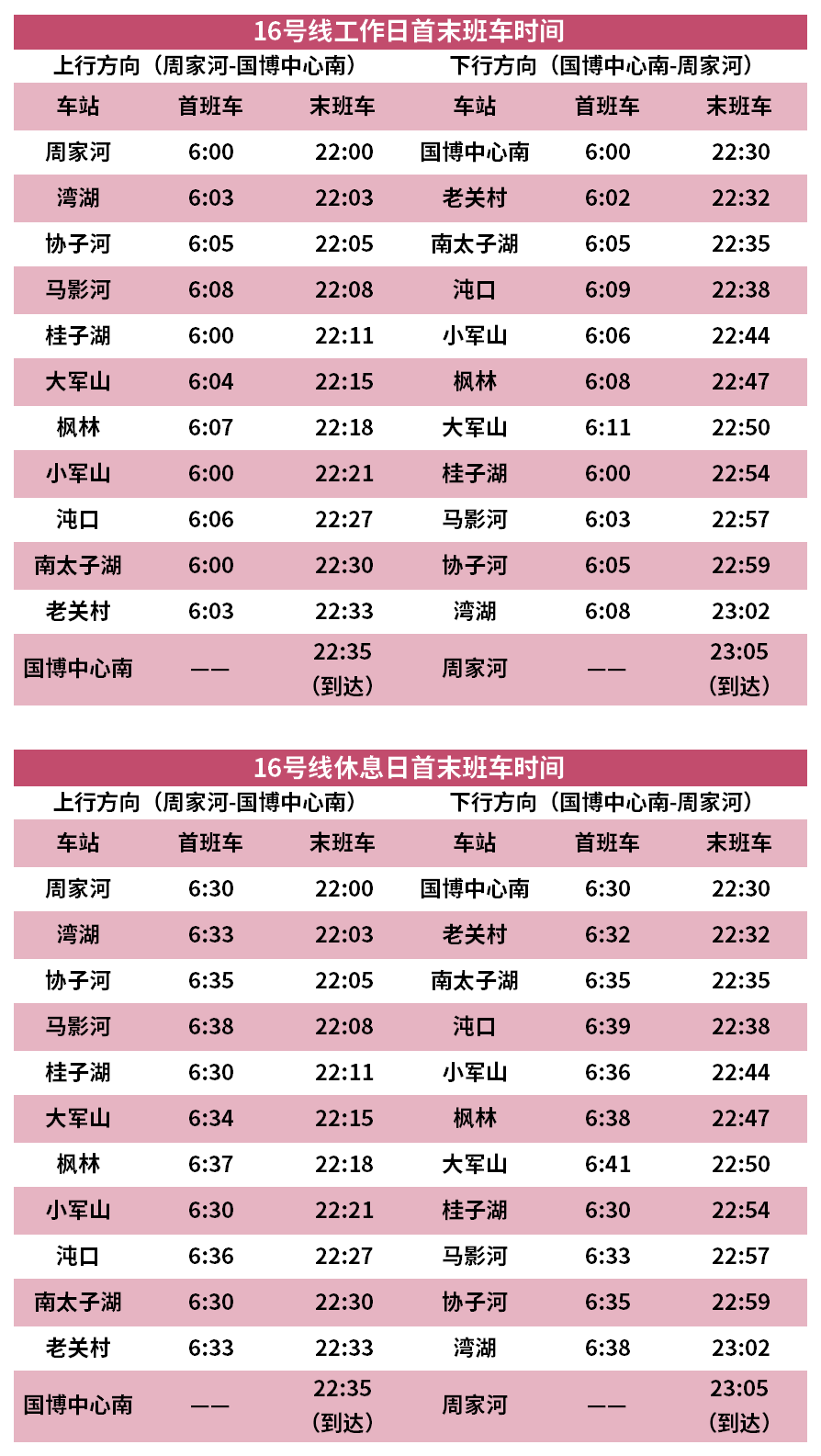 12月27日起,工作日16号线运营时间为6:00至22:30;双休日16号线运营时间为6:30至22:30。国家法定节假日及其他特殊情况另行通知。
