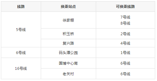 5号线、6号线二期、16号线工程开通后,将新增换乘站6座,届时徐家棚站将实现5号线、7号线、8号线三线换乘。具体换乘信息如下表。