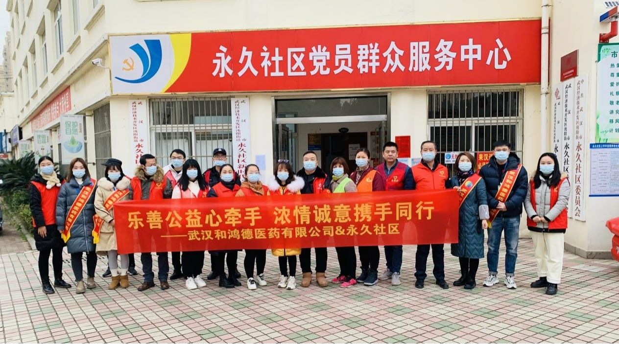 12月31日早上,沌阳街永久社区携手武汉和鸿德医药公司开展“张灯结彩迎新年,齐心协力谱新篇”公益活动,为社区保洁员、卡口值守人员送去100份暖心早餐,同时给社区商户送去中国结、永久幼儿园小朋友们送去糖葫芦,并致以节日的祝福。