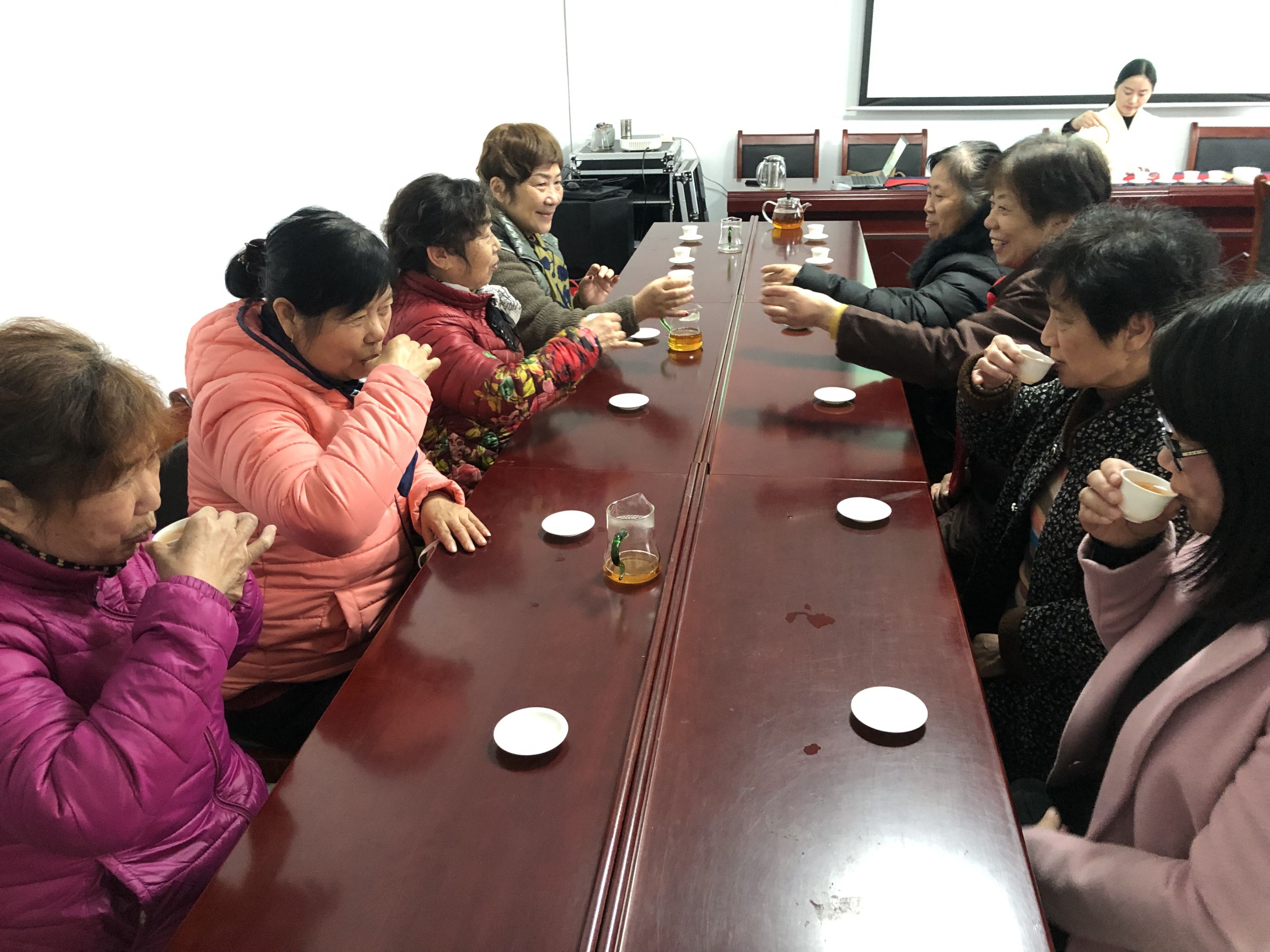 活动现场,老师首先向大家介绍所用的茶具、茶盘、公道杯、紫砂壶等,然后现场以红茶为例,给大家展示了冲泡艺术,从温杯、醒茶、摇香等,从茶的礼仪讲到与茶交相辉映的琴棋书画,大家静静地听着,从中感悟博大精深的茶文化,心灵的一次清新之旅。当红茶泡好后,大家纷纷捧起一杯,慢饮细酌,感受红茶沁入心脾的滋味,边学边品,让整个活动室弥漫着淡淡的茶香。随后大家坐在一起话家常,分享养生秘笈,共叙乐闻趣事,回忆往昔,展望未来,整个活动在一片欢声笑语中结束。