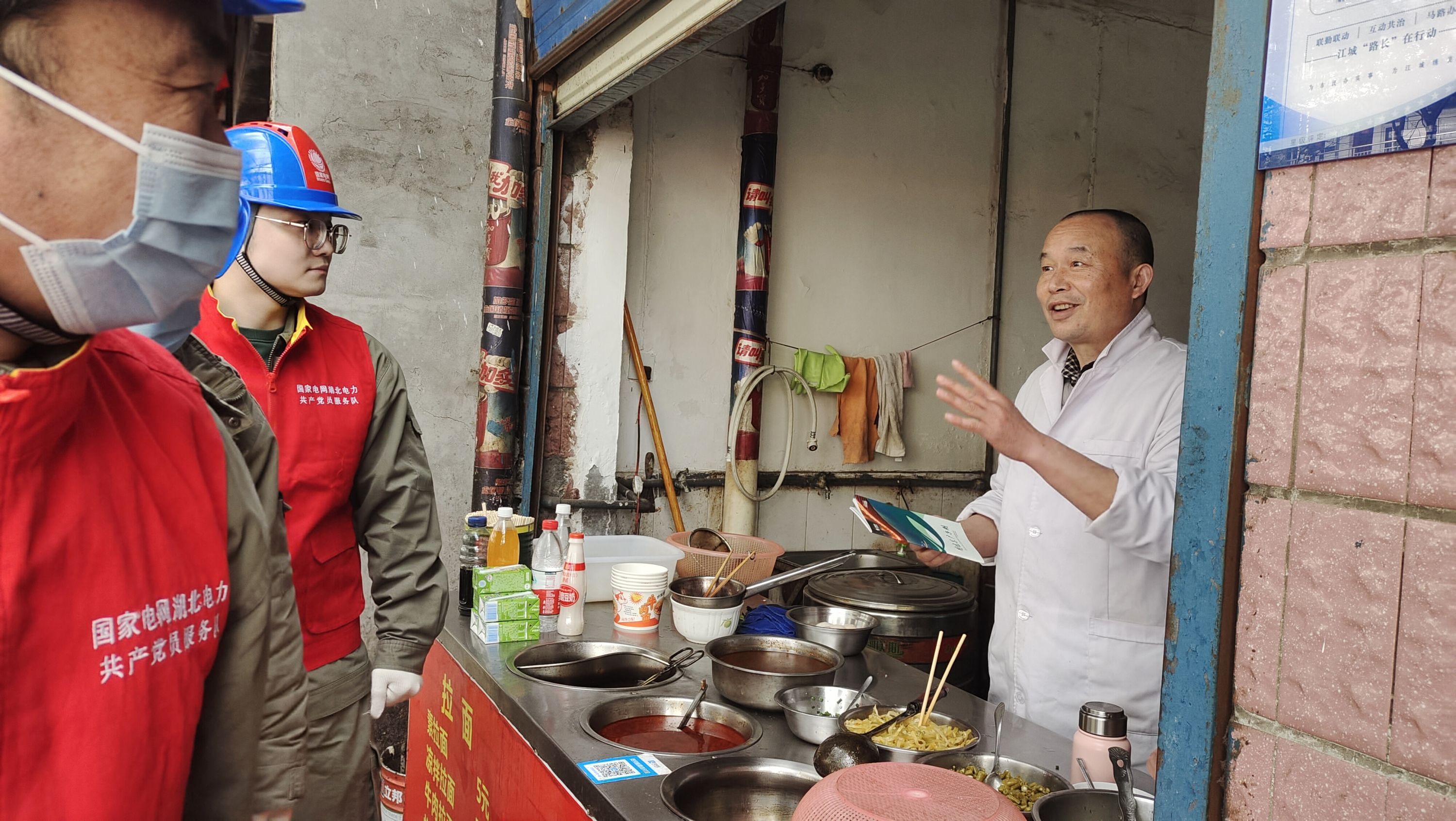 1月29日上午,在军山黄陵古镇上,一群电力红马甲奔走在细雪纷飞的大街小巷,格外显眼。早点摊的李大爷正准备收摊,国网武汉市沌口供电公司沌阳供电服务站的工作人员王恒迎面而来,递上一本《用电客户手册》亲切说道。