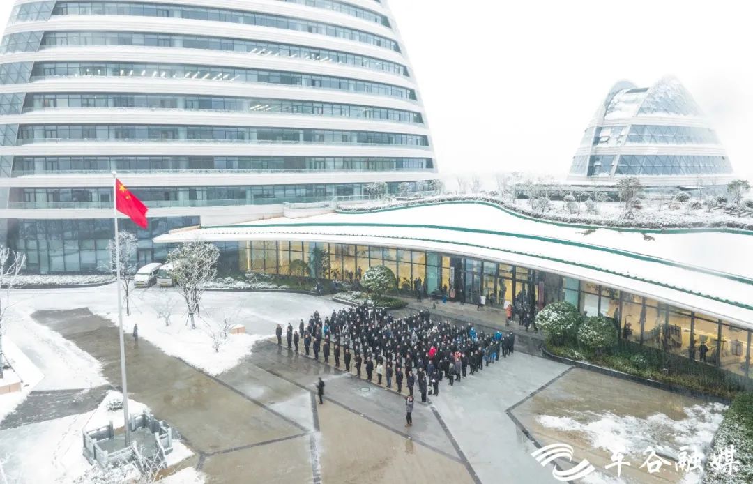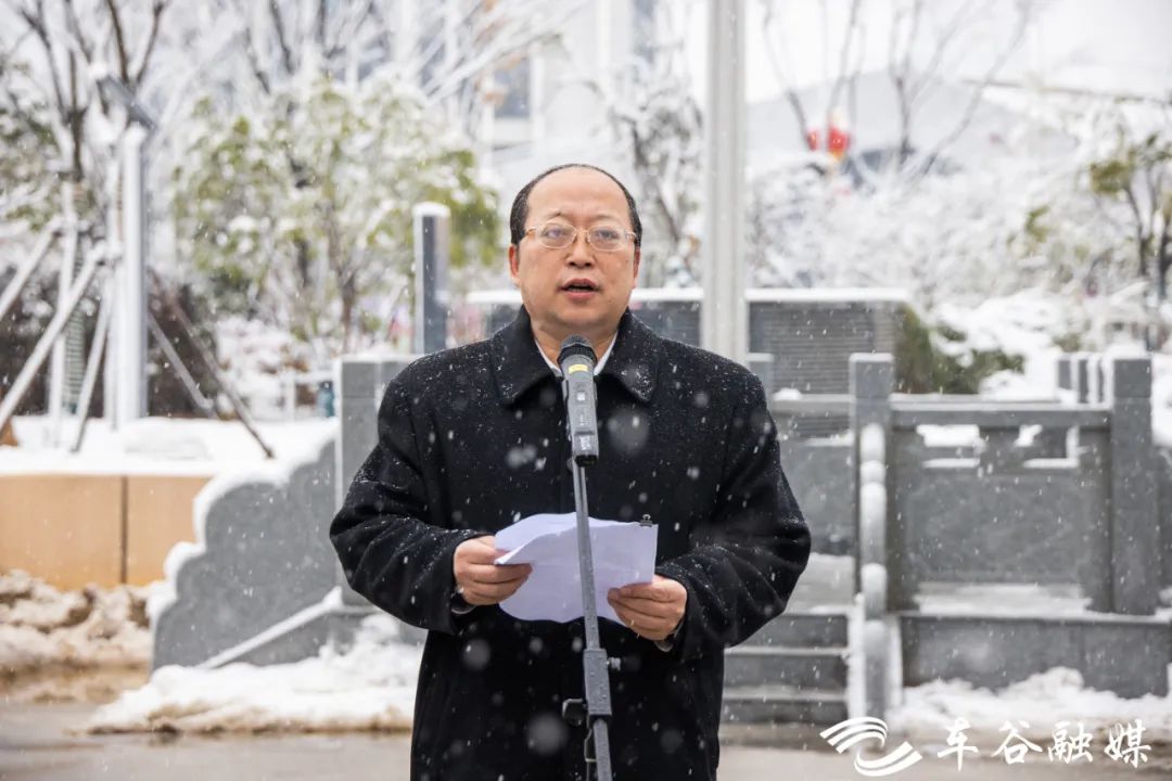车谷融媒2月7日讯 人勤春来早,奋斗正当时。2月7日,虎年上班第一天,瑞雪飘洒,武汉经开区在军山新城“春笋”办公楼举行庄严的升国旗仪式,吹响虎年奋力“追转超”的集结号,激励广大党员干部铆足干劲、振奋精神,以更加饱满的热情和昂扬的斗志,投入到车谷二次创业再出发的新征程中。
