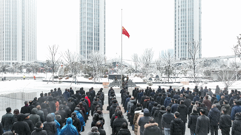 上午7时45分,升旗仪式正式开始,在银装素裹的大楼前,仪仗队迈着铿锵有力的步伐,护卫着五星红旗走向升旗台。伴随慷慨激昂的中华人民共和国国歌《义勇军进行曲》,五星红旗冉冉升起,在场的党员干部在雪中凝望高高飘扬的五星红旗,满怀激动与自豪齐声高唱国歌。