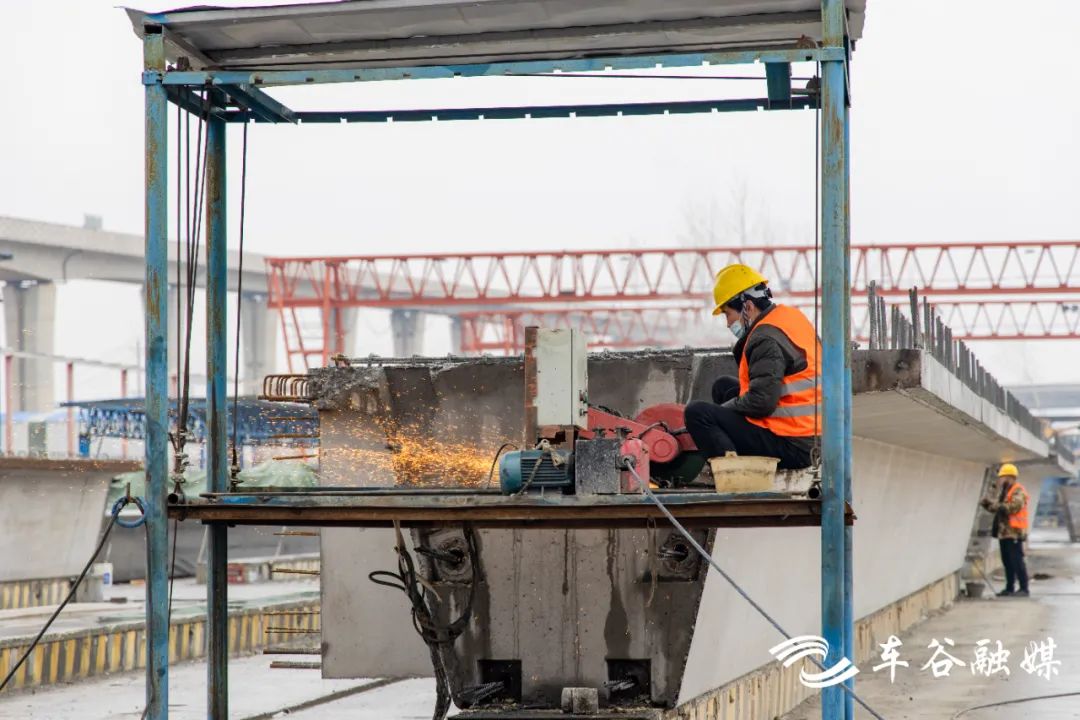 车谷融媒2月9日讯 开局就奔跑,起步即冲刺。2月9日,左岸大道长河段项目工地长江岸边的积雪尚未融化殆尽,但施工现场热火朝天,工人们有条不紊地预制和拼装钢梁,工程机械的轰鸣声和工人的吆喝声交织共响。