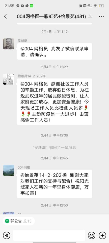 车谷融媒2月15日讯 “感谢社区工作人员的辛勤工作,放弃假日休息,为往返武汉过年的居民做核酸检测,让大家能更放心,更加安全健康……”这是沌阳街阳光城社区居民杨先生在微信群对网格员的“告白”,也是阳光城社区工作人员在春节期间工作不停歇的缩影。
