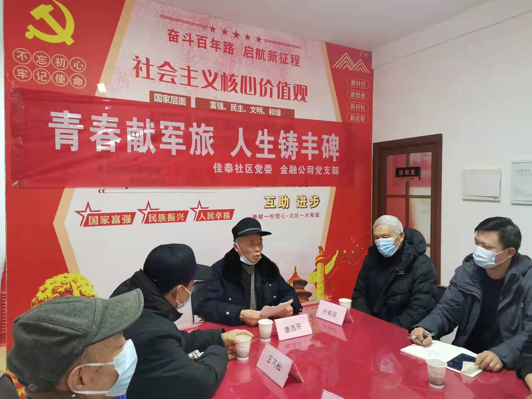 佳泰社区党委联合经开公司下属金融公司党支部通过座谈会的方式,与退役老兵及其家属进行了亲切的交谈,详细了解他们的身体情况和生活状况,积极征求他们对社区工作的意见和建议,并对他们为国家和人民所做出的贡献表示衷心的感谢和敬意,最后为他们送去了慰问物资及光荣牌。