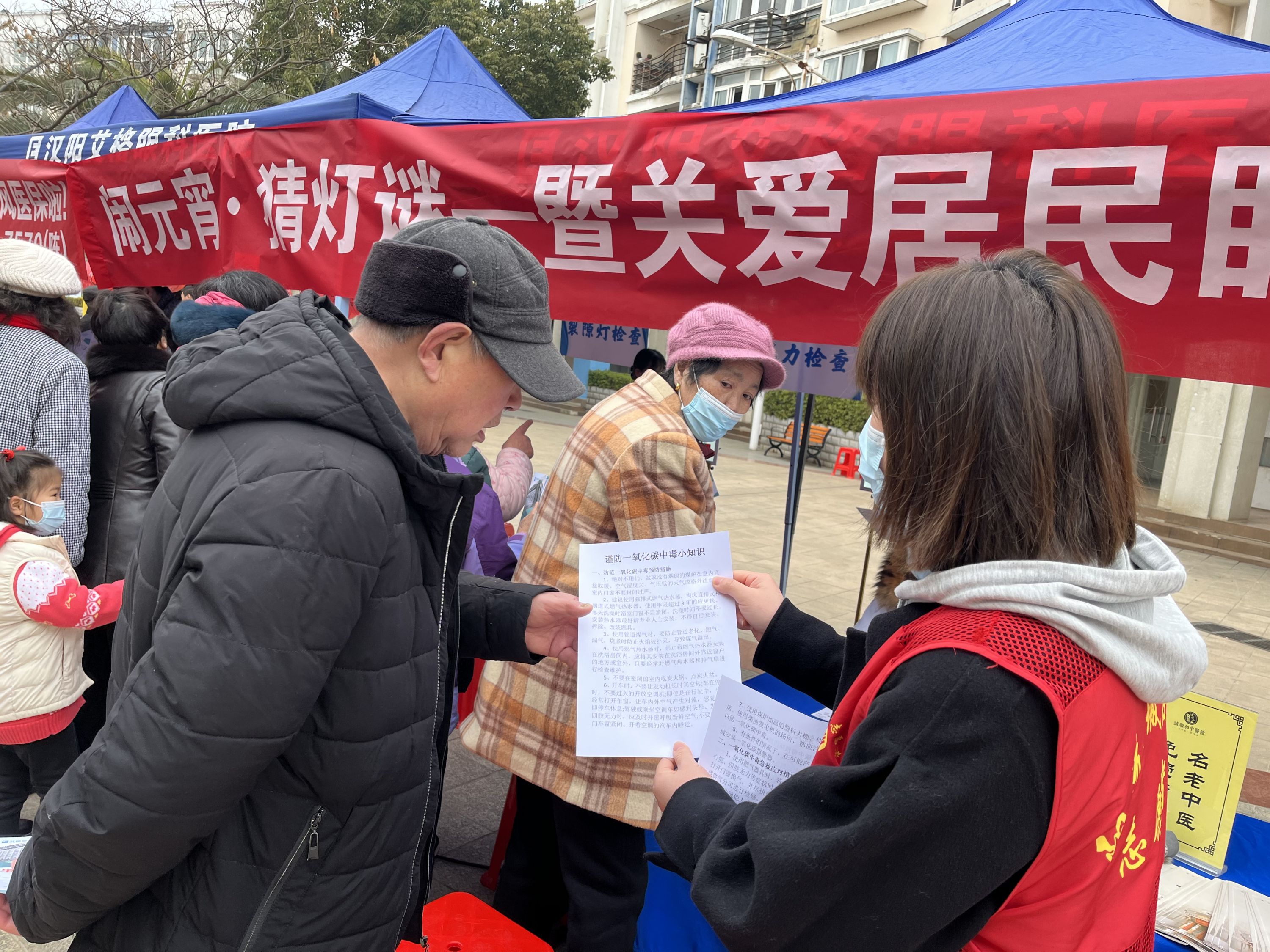 同时,艾格眼科的眼健康检查活动也井然有序地开展。此次的眼健康检查内容包括测视力、裂隙灯检查和专家咨询三个部分,在居民们等待检查的过程中,也不时能看到志愿者给居民宣传《谨防一氧化碳中毒小知识》和普及眼健康知识。