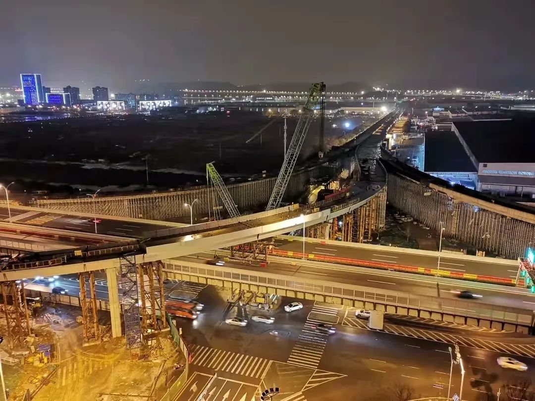 为确保施工安全顺畅,施工单位精确测量模拟,研究采用桥梁上部结构预制钢箱梁安装方式,上跨东风大道的钢箱梁在施工现场外制作完成后运输至施工现场,使用吊机在封闭施工现场范围内传输架设。为了防止对现有东风大道桥梁造成损坏,施工单位对原桥受力和变形情况进行全过程的监测,最大程度上减少施工安全风险。