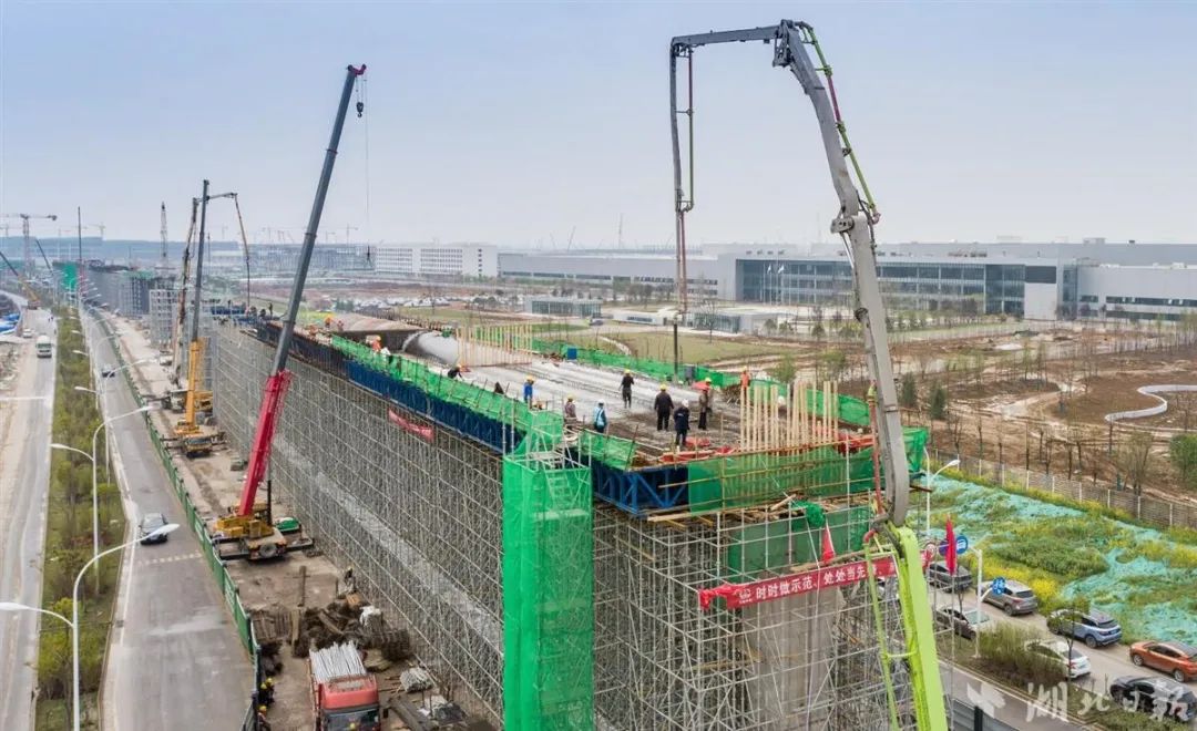 在武汉经开区纱帽大道与兴城大道交汇段,轨道交通16号线二期工地长逾4公里。纱帽大道地处武汉经开区通航产业园内,沿线分布着吉利路特斯、小鹏汽车、中航锂电等新能源汽车产业项目,总投资数百亿元,是中国车谷倾力打造的“新能源汽车产业大走廊”核心区。