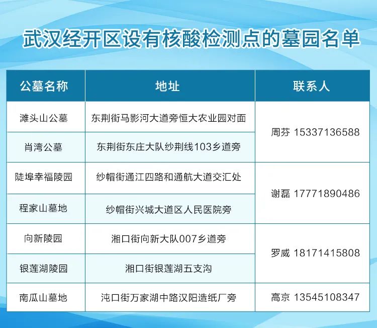 为切实做好疫情防控,武汉经开区在滩头山公墓、肖湾公墓、陡埠幸福陵园、程家山墓地、向新陵园、银莲湖陵园、南瓜山墓地卡口处均设有核酸检测点,对省外(来)返汉人员无抵达检(即抵达本地无24小时核酸检测证明)进行现场检测,具体名单附后。
