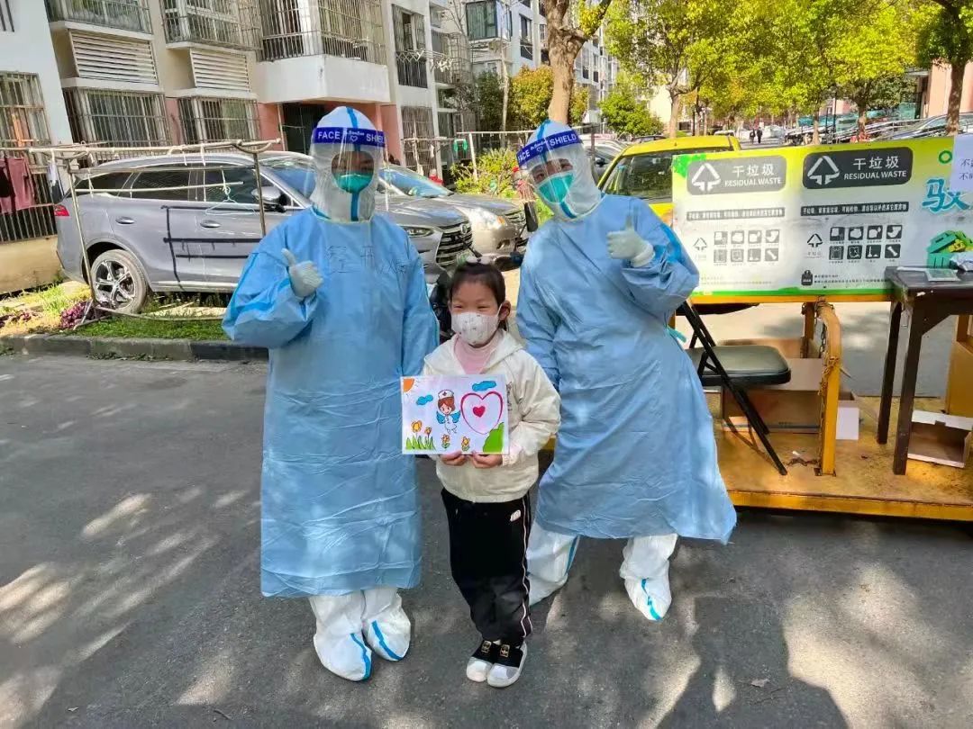 当天采样工作即将结束时,家住浦锦社区景舒苑三期的小女孩汤蓓贝在母亲的鼓励下,小心翼翼地走到经开医院医护人员面前,将自己画的漫画送给医护人员,感谢她们的无私付出。