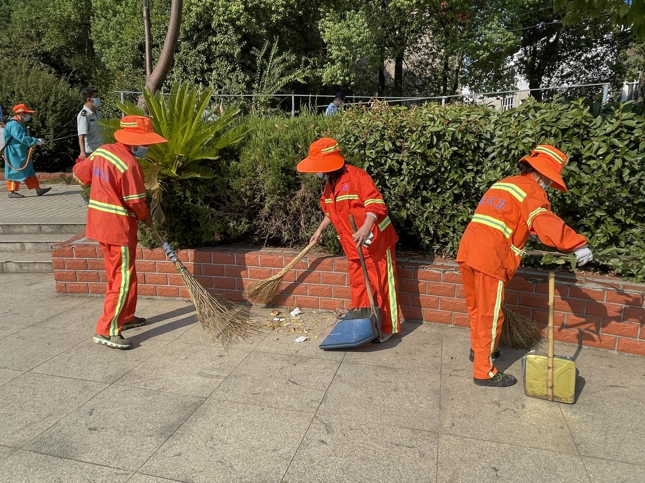 工作人员一行深入老旧小区,清理小区广场枯枝落叶、绿化带内垃圾、角落杂物,整理旧物乱堆乱放,为小区居民营造良好的居住环境。