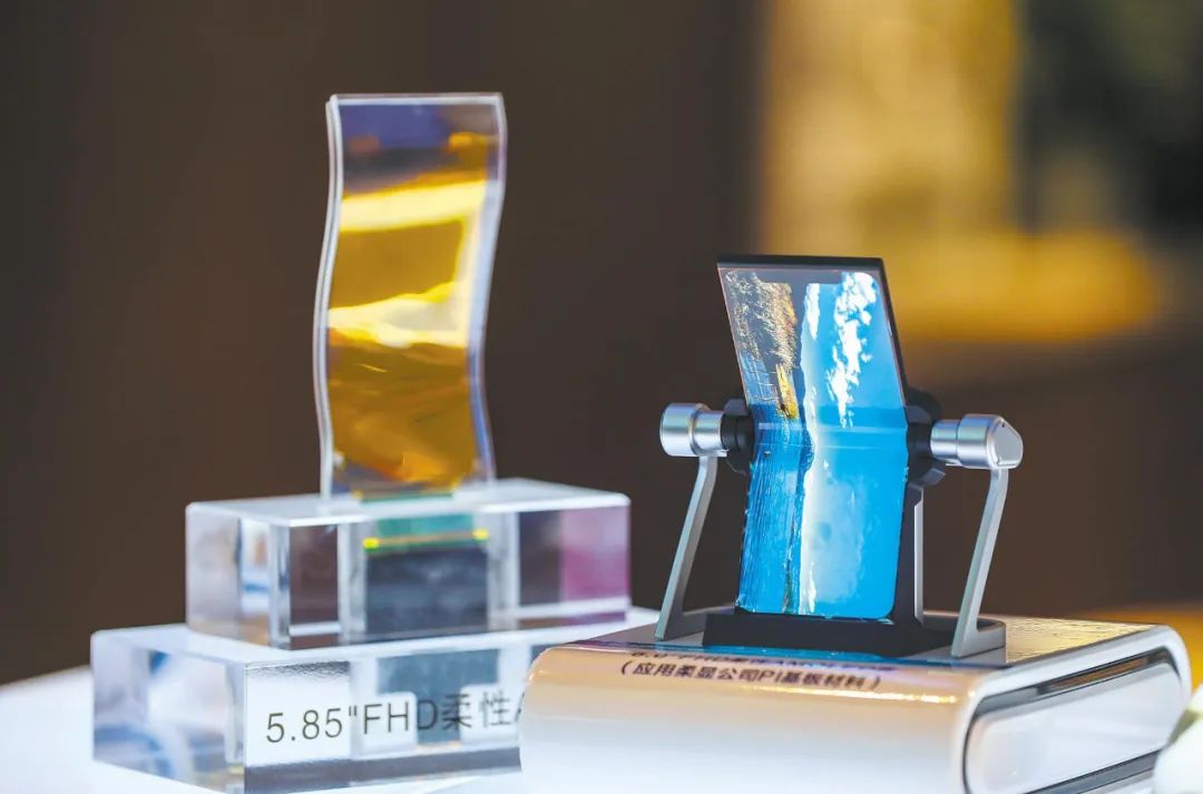 在光电显示材料领域,有一种被称为“黄金薄膜”的材料——PI(聚酰亚胺)膜。它薄如蝉翼,厚度仅有15-20微米,但能承受200兆帕的强度。以PI膜为基板制成的显示屏,可以像纸一样折叠、弯曲,是当下制造折叠屏手机的宠儿,未来还将在可穿戴电子设备中大量使用,市场前景十分广阔。