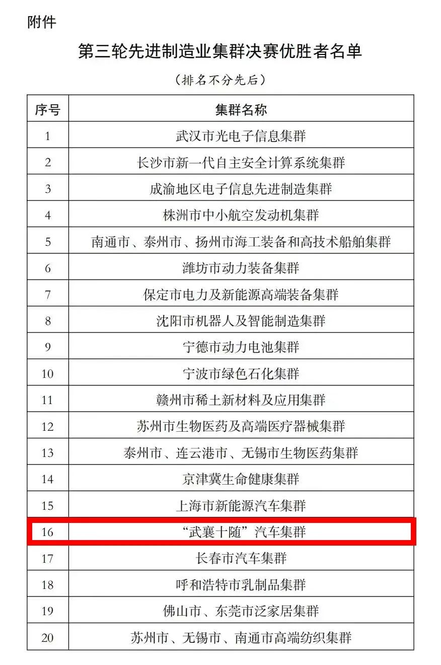车谷融媒11月4日讯 11月2日,工业与信息化部第三轮先进制造业集群决赛优胜者名单公示结束,全国20个先进制造业集群胜出,以武汉经开区为龙头的“武襄十随”汽车集群进入决赛优胜者名单。