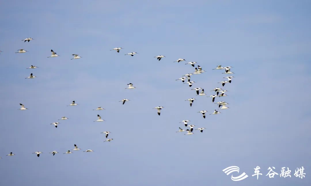 2022年11月5日,成群的反嘴鹬翱翔在军山官莲湖上空。李岿 摄