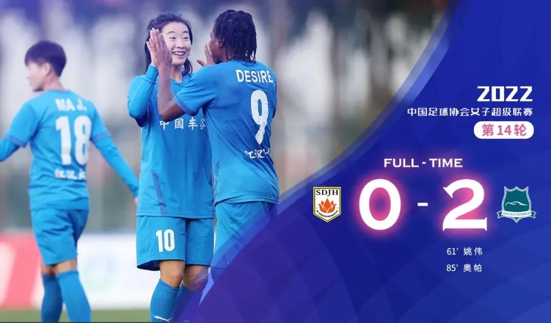 11月4日18时10分,武汉车谷江大女足在2022年中国足球协会女超联赛第14轮较量中凭借队长姚伟和外援奥帕的进球,2:0击败山东体彩女足,以领先第二名江苏女足13分的巨大优势,提前4轮夺得女超联赛冠军。