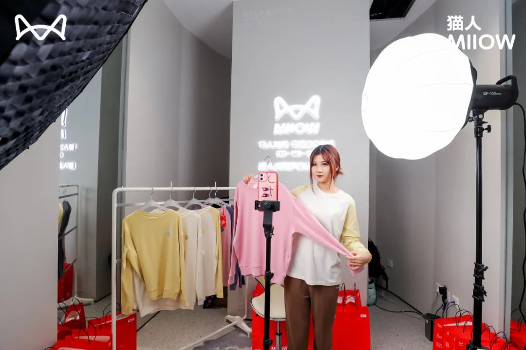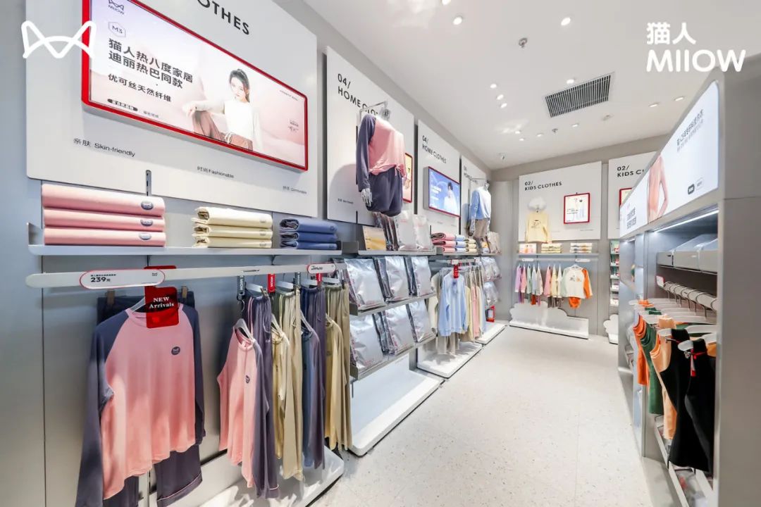 该店也是猫人科技内衣生活馆的首家旗舰店,面积300平方米,主要分为袜品区、家居服产品区、保暖产品区、轻运动产品区和儿童产品区等,布局科技感更强,视觉效果更引人,直观传达“科技内衣”理念。店内还设有直播间,主播可在店内线上直播带货,线上线下同时发力,单店年销售额目标超千万元。