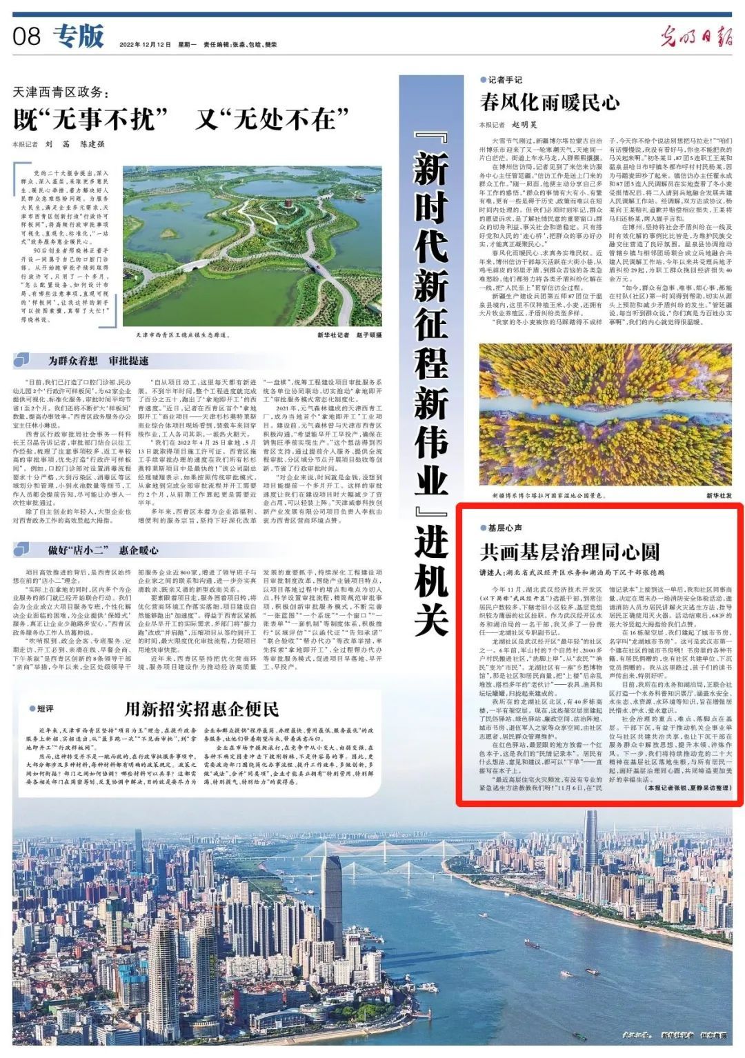 12月11日,《光明日报》推出“新时代新征程新伟业”进机关专版,其中“基层心声”栏目采访了区水务和湖泊局下沉干部张德鹏,展现了他在下沉社区期间学习贯彻党的二十大精神的典型做法和良好风貌。