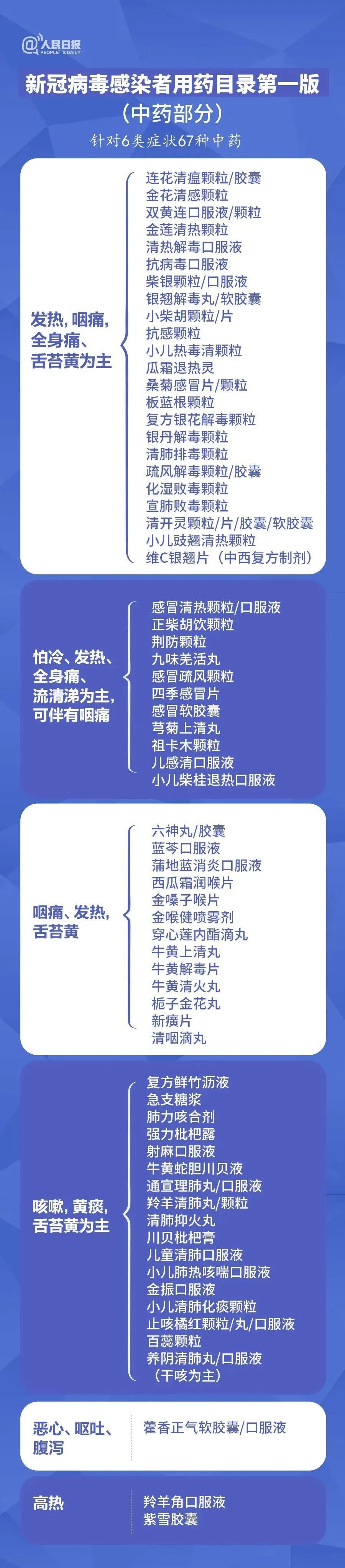 此版用药目录按照中西药分开的原则,是对国家第九版诊疗方案中推荐用药的完善和补充,针对发热、咽痛等6类中医诊断症状推荐67个中药品种;针对咳嗽、咳痰等4类临床症状推荐41个西药品种。