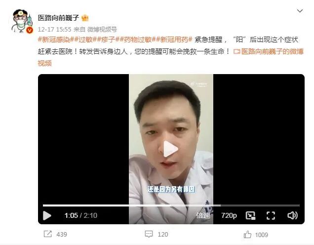 12月17日,北京大学第一医院密云医院急诊科医生高巍在微博发布视频表示,一旦在感染新冠病毒期间,出现身上痒等情况,很有可能是过敏,需要引起重视,必要情况需紧急就医。