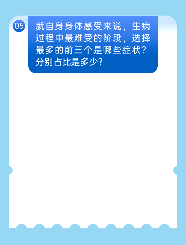 康复者们认为生病过程中最难受的症状,排前三位的是浑身疼(56%)、发烧(55%)、咳嗽(51%)。
