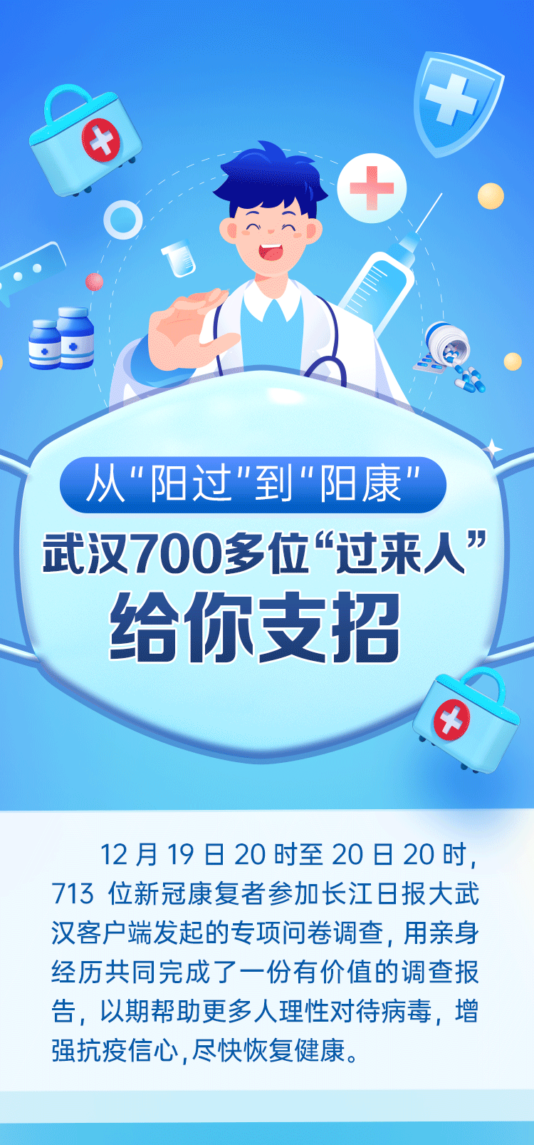 近来,不少新冠感染者经历了从“阳过”到“阳康”,开始回归正常工作生活。几天有好转、怎么缓解症状、使用药品情况、返岗怎么办……19日20时至20日20时,短短24小时,713位新冠康复者填写长江日报大武汉客户端发起的专项问卷调查,用亲身经历共同完成了一份有价值的调查报告,以期帮助更多人理性对待病毒,增强抗疫信心,尽快恢复健康。
