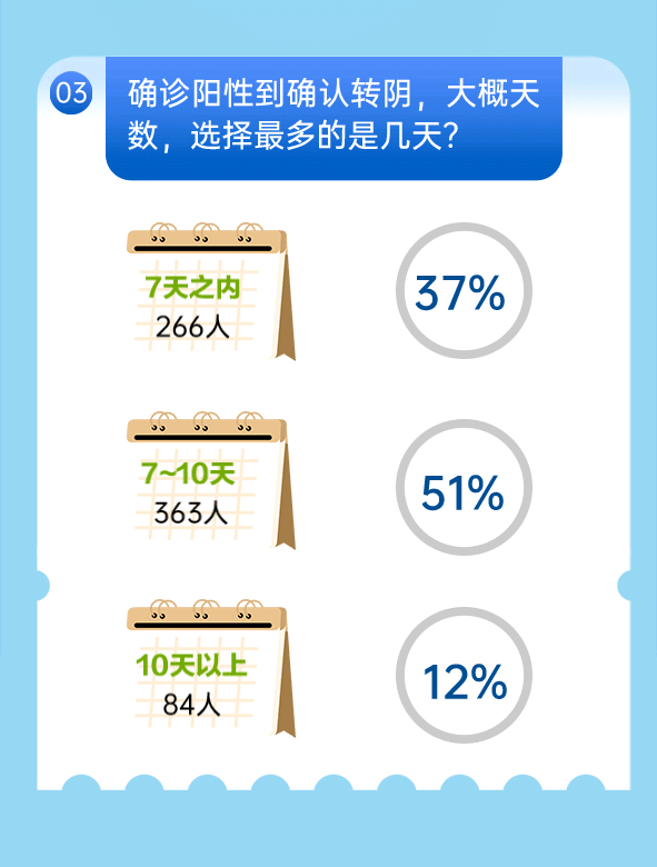 从确诊阳性到确认转阴,选择最多的是7—10天,占比51%,也就是约半数感染者在7—10天左右转阴。