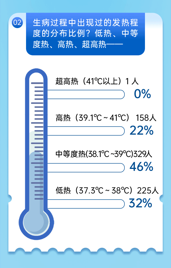 生病过程中,出现过的发热程度分布比例上,46%的人出现了中等度热(38.1℃—39℃),占比最高,出现低热(37.3℃—38℃)的人占到32%,高热(39.1℃—41℃)的人占到22%。