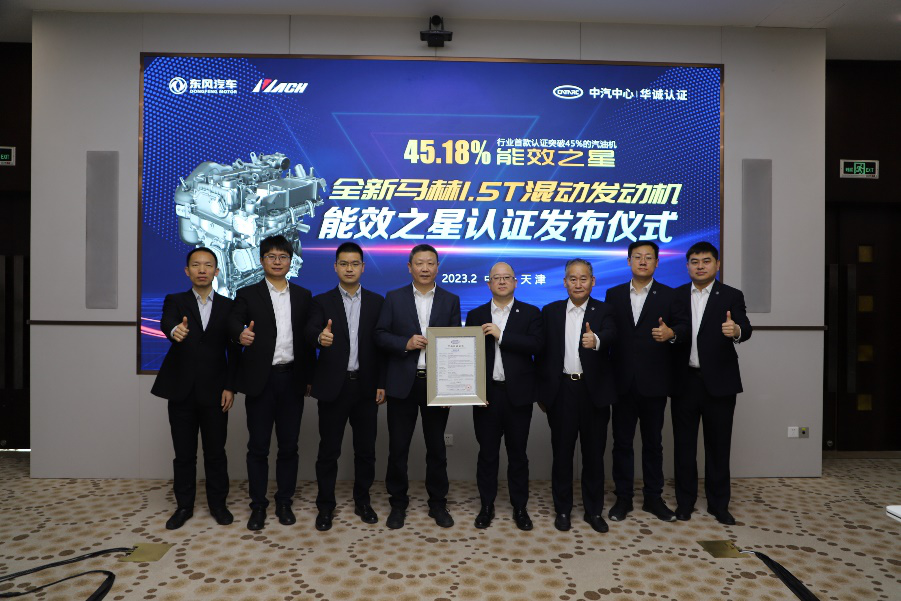 ▲东风全新马赫1.5T混动发动机“能效之星”认证发布仪式。