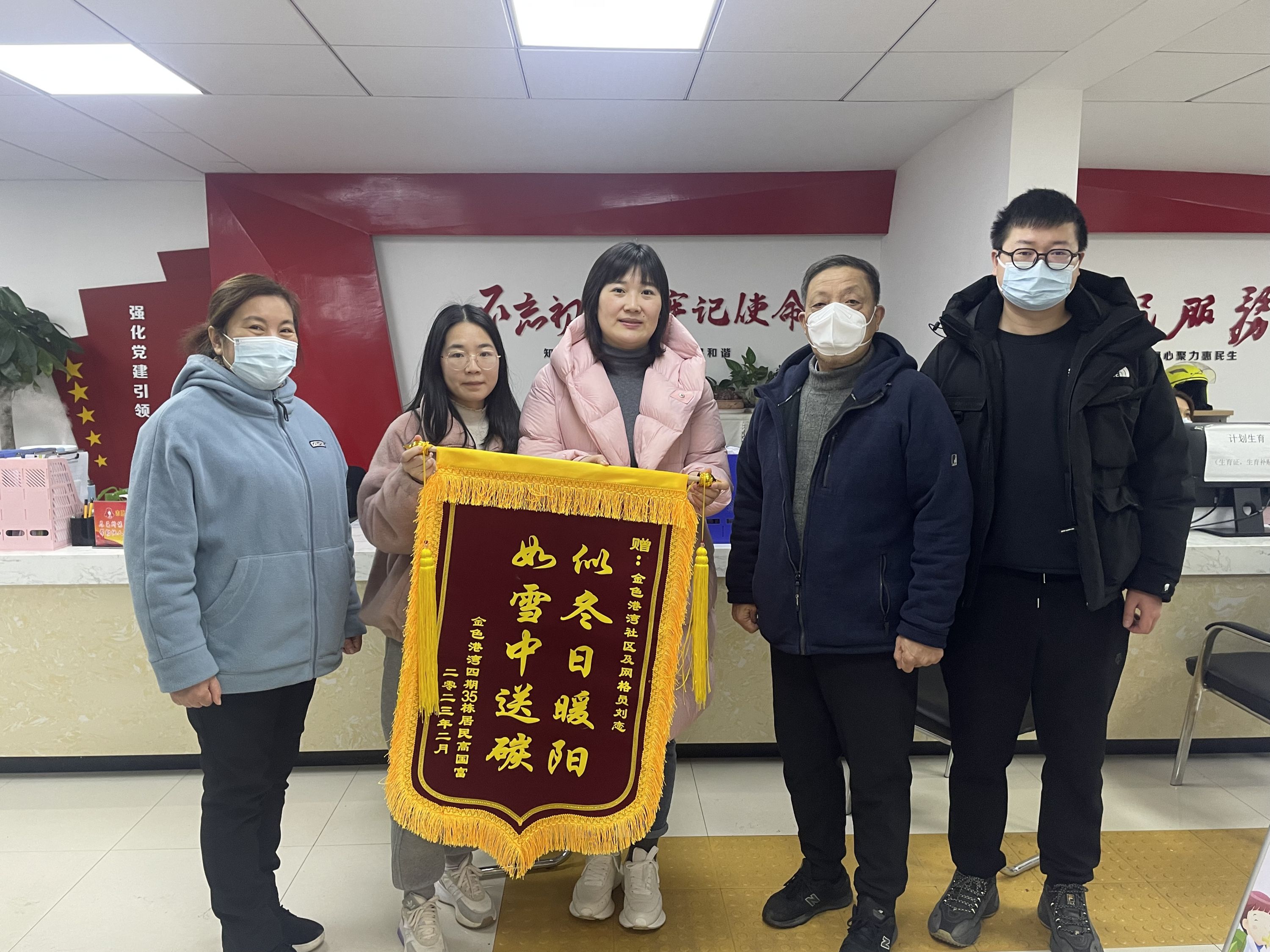 2月13日上午,老人的女婿带着一面锦旗来到社区,感谢社区的及时帮助。