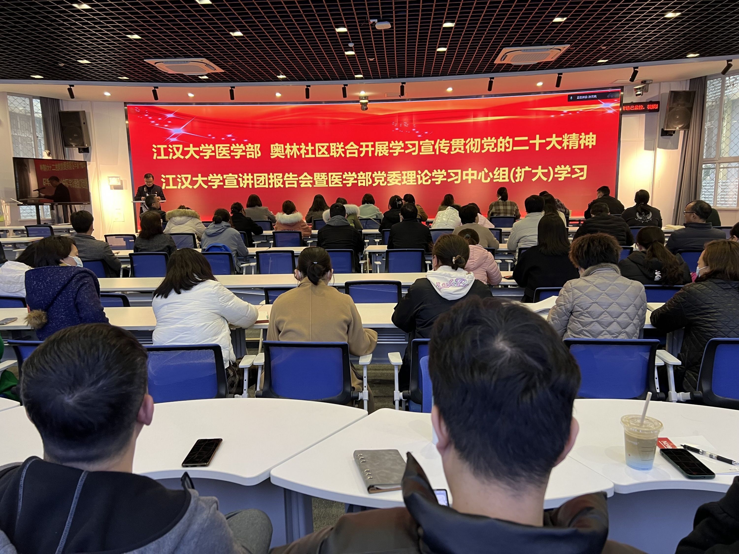 车谷融媒3月27日讯 3月23日下午,江汉大学医学部、奥林社区联合举办学习宣传贯彻党的二十大精神宣讲报告会。江汉大学学习贯彻党的二十大精神宣讲团成员、马克思主义学院教师储著斌研究员应邀作报告。