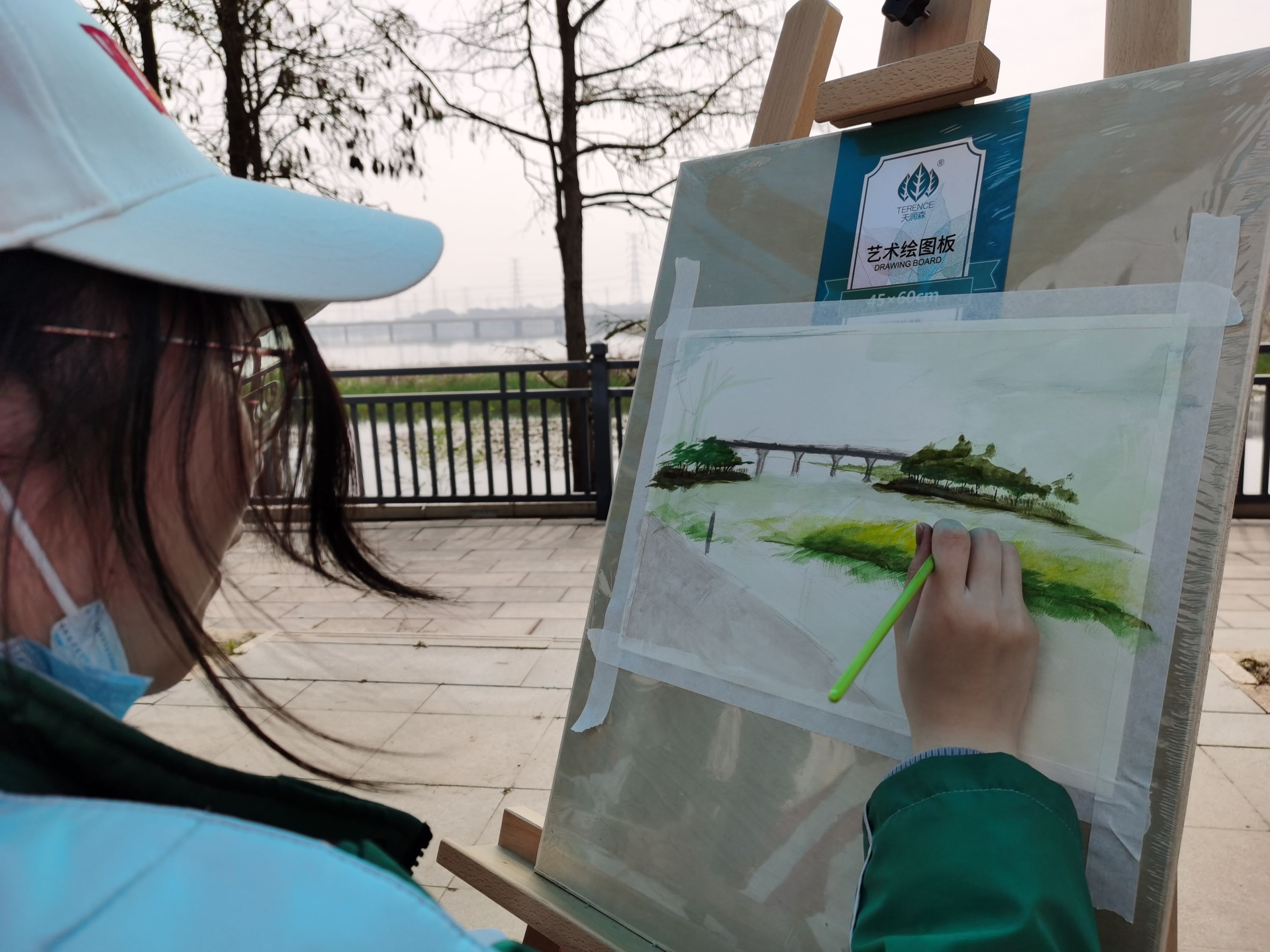 一笔一画描绘水清岸绿生态美。春日水光潋滟,湖畔芦苇、再力花等水生植物,与对岸工厂红白相间的烟囱倒影奇异交织,为学生户外写生提供了丰富的创作素材。学生们现场搭台,用优美的线条、绚烂的色彩勾勒河湖美景,描绘成一幅幅展现沌口生态之美佳作。