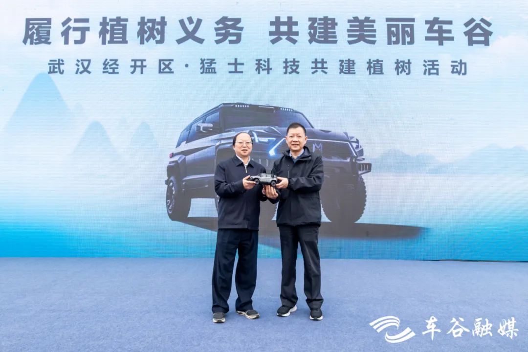 活动中,杨青代表东风公司向经开区赠送猛士车模,参加活动的嘉宾携手种下樱花树、桂花树,共建绿色园区。