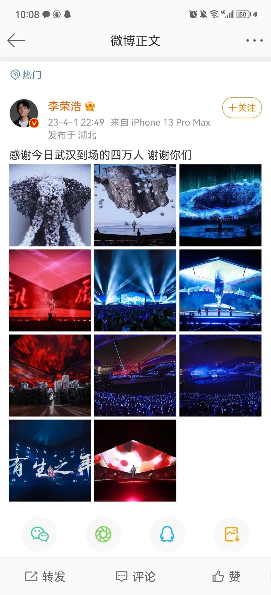 在2023年的4月,在4万观众的呐喊声中,李荣浩再次登上这座“武汉主场”的舞台。带着这座英雄城市的脉动,他回到了久违的江城。