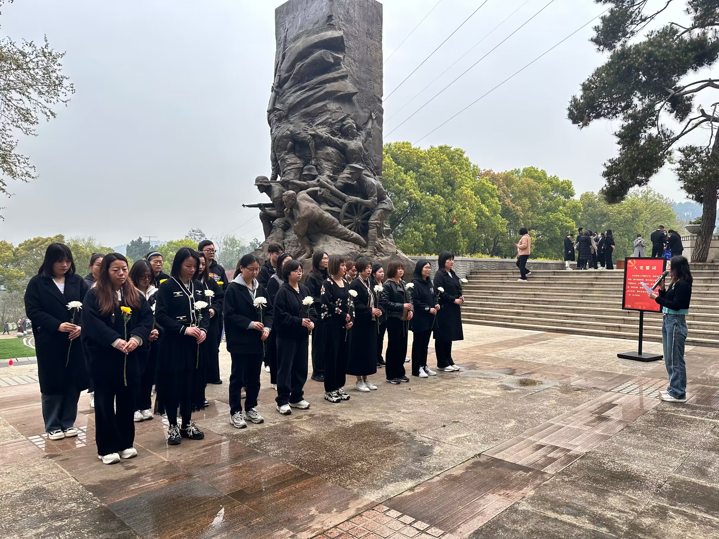武汉抗战纪念园位于武昌石门峰,是武汉市唯一以纪念抗战为题材的主题纪念性公园。在庄严肃穆的纪念碑前,金色港湾社区党委书记带领25名共青团员以鲜花寄托哀思,重温入团誓词,进一步坚定青年团员的共产主义信仰,激发爱国主义情怀。