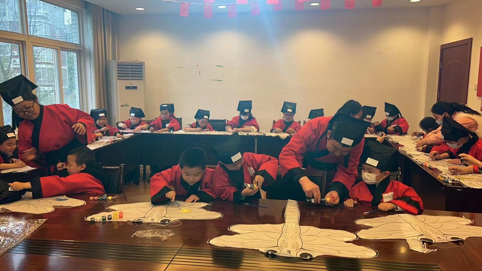 在风筝描绘环节,小朋友们按照自己的喜爱,自由发挥,画出心中最美的风筝。