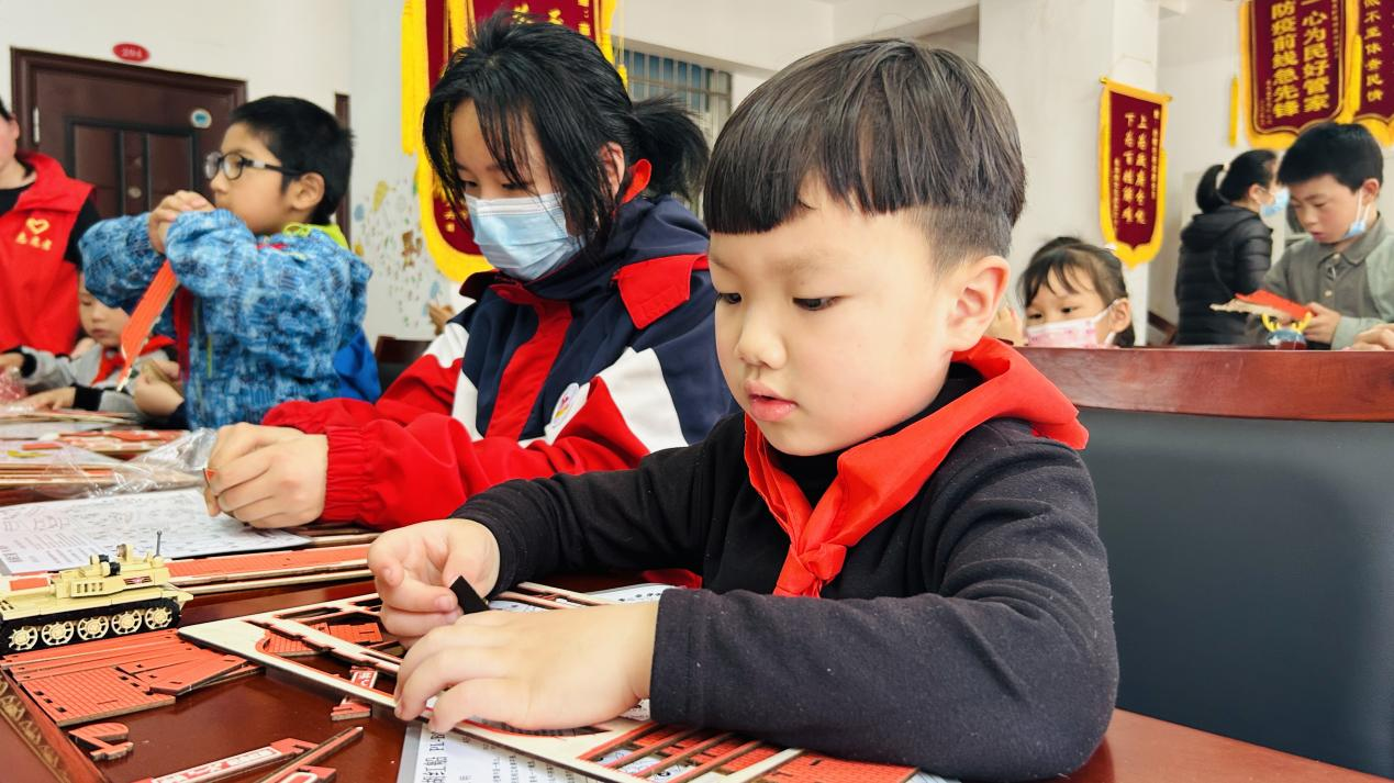 随后在老师和志愿者的指导下,孩子们迫不及待地开始了在手工DIY红船模型制作。孩子们向志愿者们请教拼接“红船”模型的小技巧,尽管船模制作有一定难度,但是大家仔细研究,互相启发,共同努力,一艘艘精美的红船模型便在孩子们的巧手中诞生了,“我想把这艘‘红船’带到学校,让班级里的同学也能欣赏,‘红船精神’将永远激励我们,不怕艰险、乘风破浪地跟党前行。”关亦阳小朋友自豪地说道。