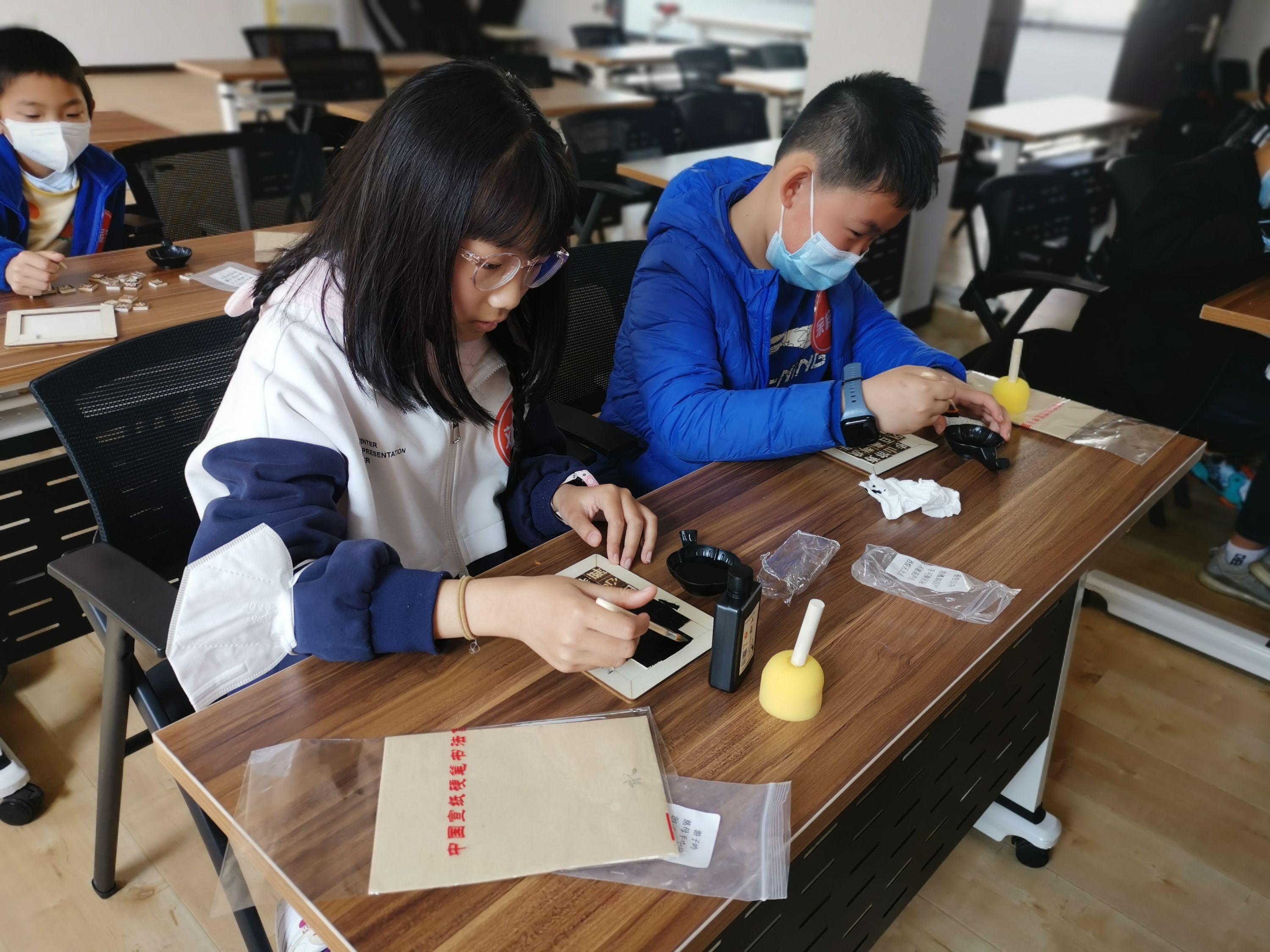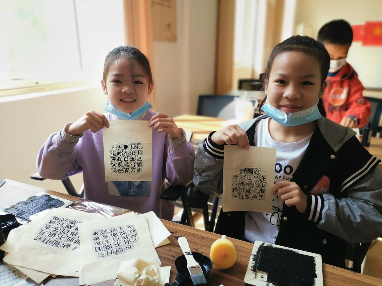 在了解制作方法后,大家满怀喜悦地踊跃上手,尝试拓制技艺。排版、上墨、铺纸、拓印、揭纸等一系列步骤后,一张张生动的活字印刷品就展现在大家的面前,其中也有部分孩子好不容易将拓印的字块摆好了,却发现成品墨迹深浅不一,但大家没有放弃,一次次反复练习,直至印刷出自己满意的作品。