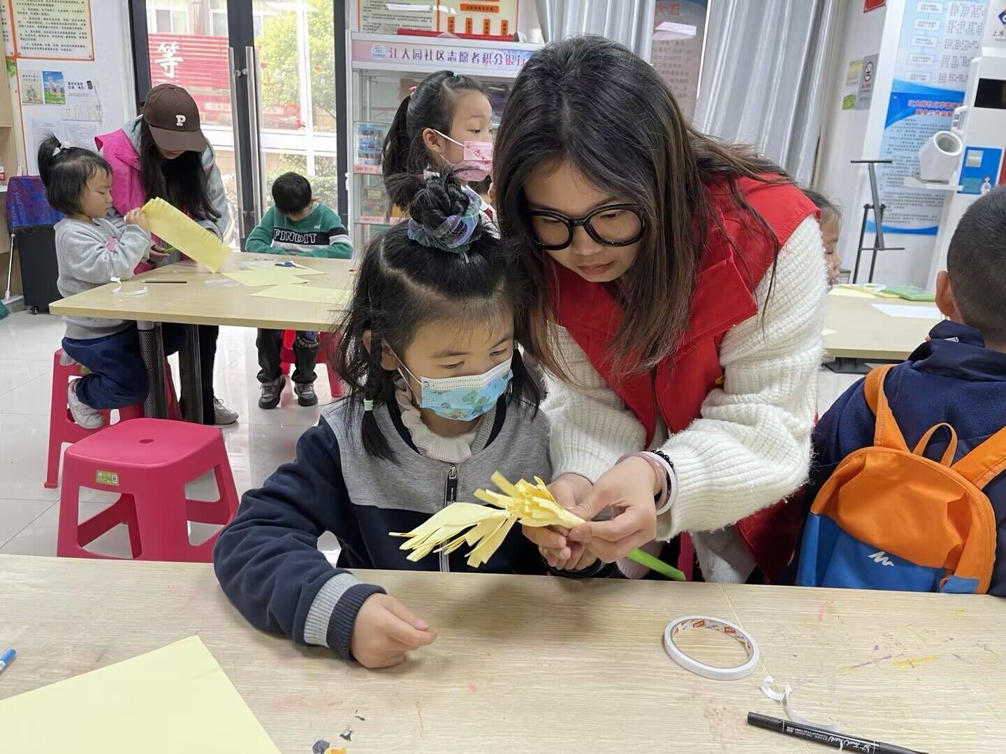 手工环节中,在认真听完志愿者老师演示制作纸花的方法和技巧后,青少年也迫不及待地开始动手剪花瓣、裁叶子、涂胶……不一会儿,一朵朵立体纸花已初成型,一朵朵寄托着清明哀思的纸花在孩子们手中悄然绽放。